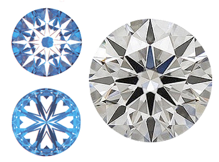 Our precise craftmanship creates the pattern of a series of eight arrowheads in the diamond with the use of an H&A's scope. If the diamond is turned up-side-down, you will see a perfect pattern of eight heart shapes. These unique features are one of the few easiest ways to analyse a diamond.